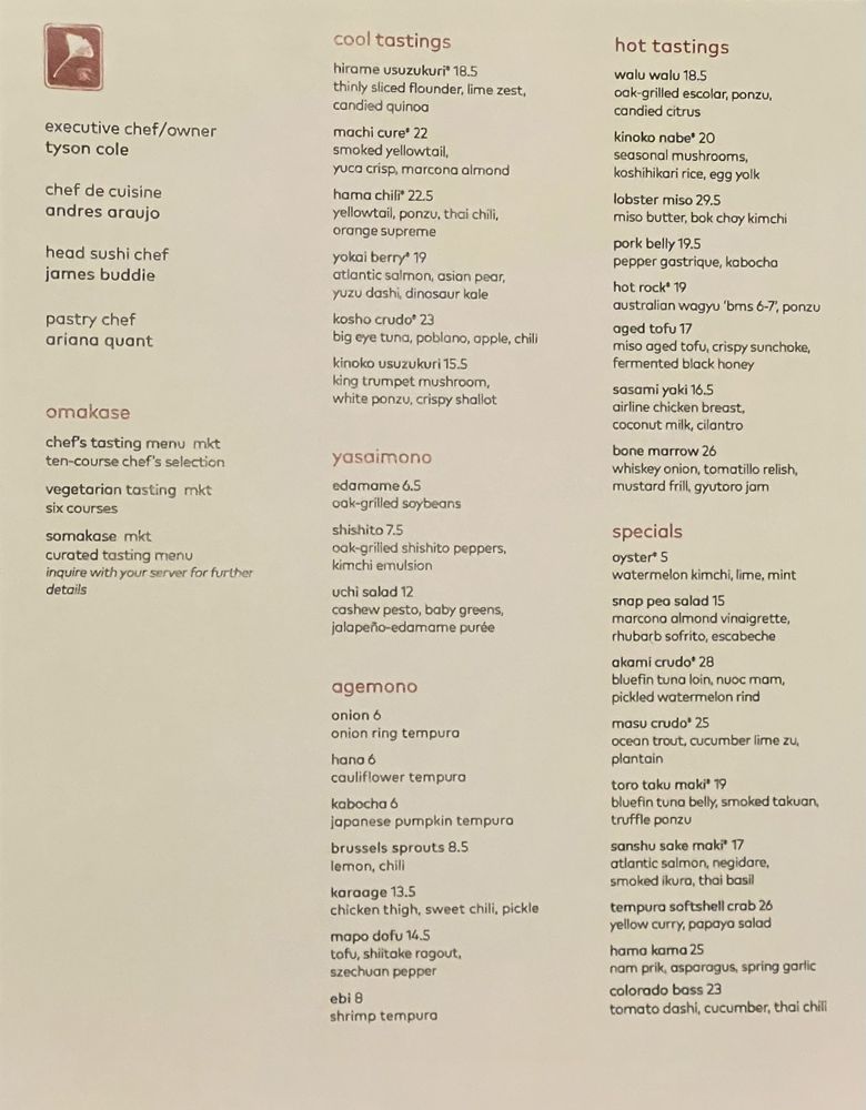 Uchi Denver brings a sophisticated blend of Asian Fusion, Japanese, and seafood dishes to the vibrant RiNo neighborhood in Denver, CO. With unique offerings like Hirame Usuzukuri and Machi Cure, the menu showcases innovation and artistry in each dish. The upscale yet intimate atmosphere, coupled with attentive service, elevates the dining experience. Customer reviews rave about the high-quality sushi, knowledgeable staff, and happy hour specials. Standout items like Kurodai Crudo and Wagyu tartare nigiri impress with their flavors and presentation. The menu also features creative dessert options like Jasmine Cream and Warm Semifreddo for a perfect ending to a memorable meal. Uchi Denver is a must-visit for sushi enthusiasts seeking a top-notch culinary experience in Denver.